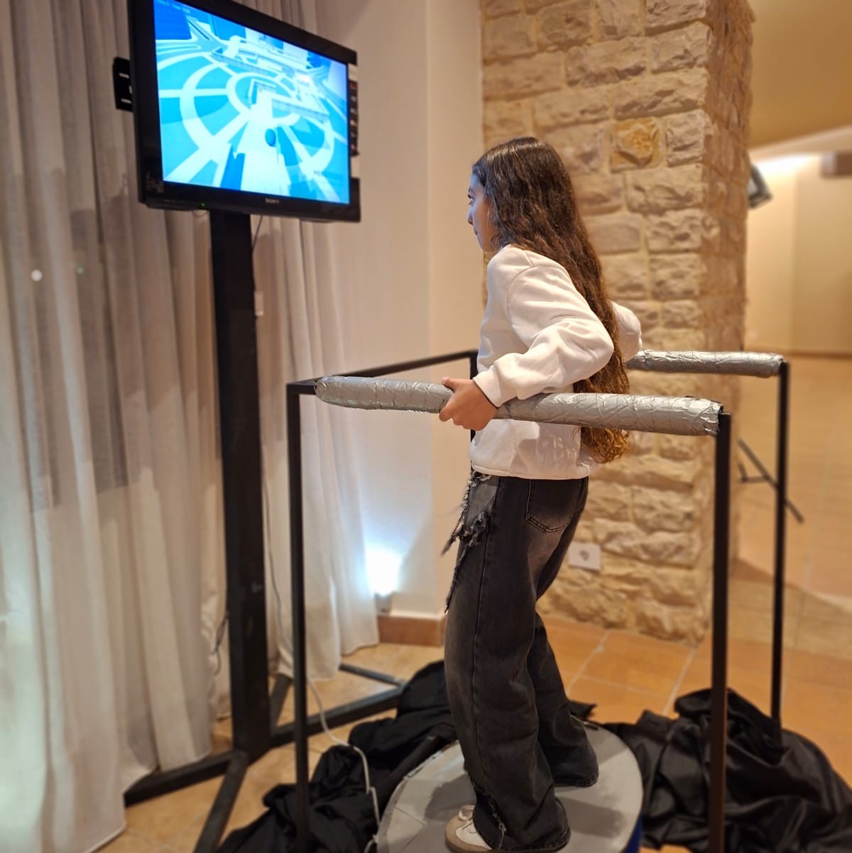 Test your agility, in this game of balance! controlled by a half inflatable ball, the player will stand over the half ball and balance his weight over the platform to balance the ball in the game
